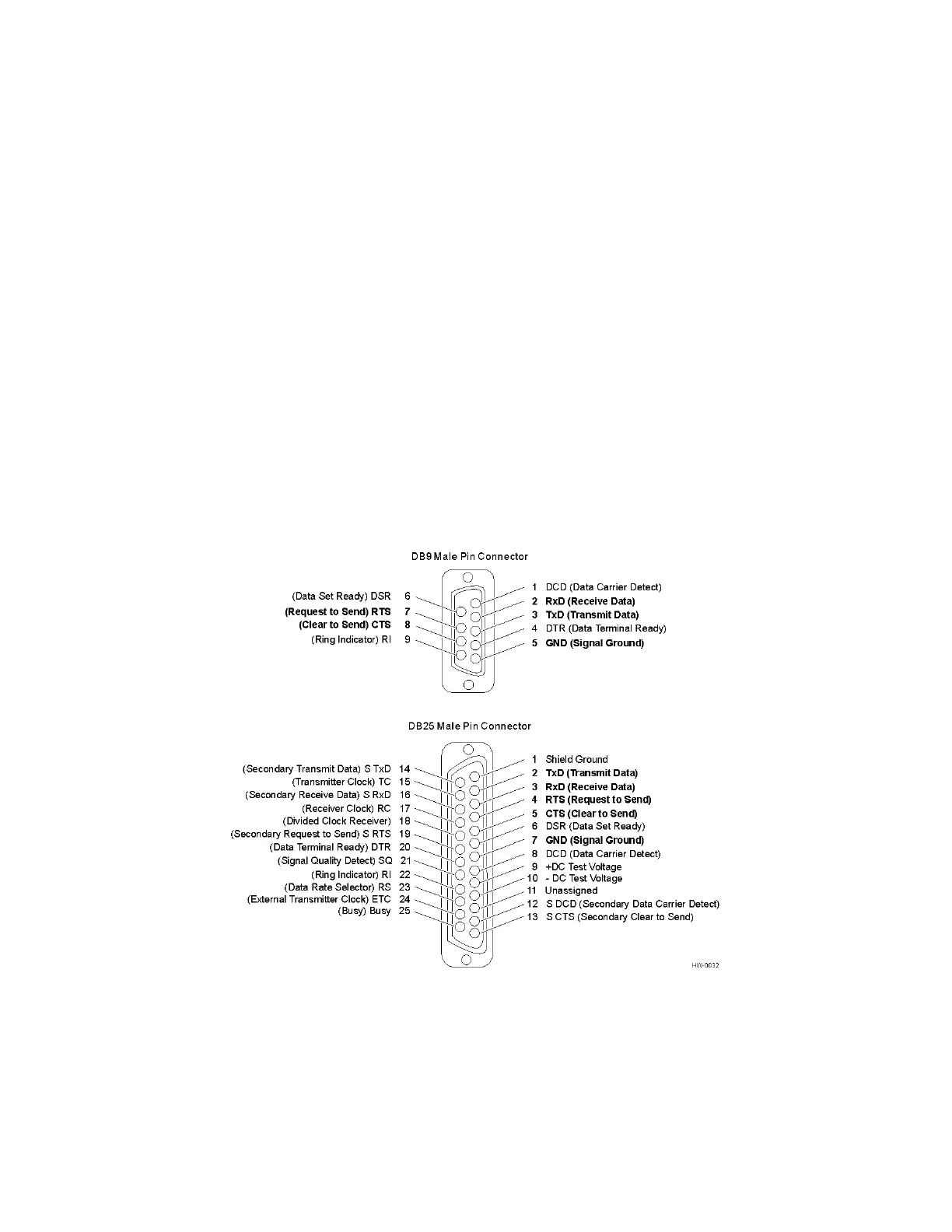The pin assignments for the signal to the host male DB9 and DB25 connectors are shown in boldface in