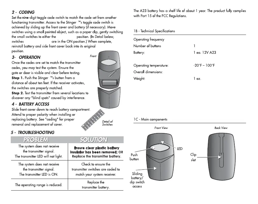 Transmitter Solutions Stinger 2 - Coding the Transmitter; Operating the Transmitter; Battery Access and Replacement; Troubleshooting Transmitter Issues