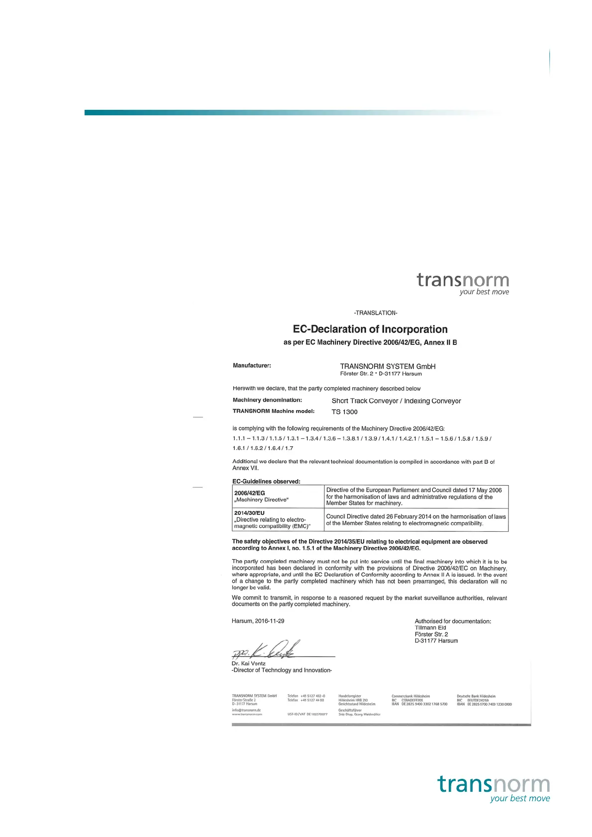 transnorm TS 1300 - Applicable Documents; EC Declaration of Incorporation