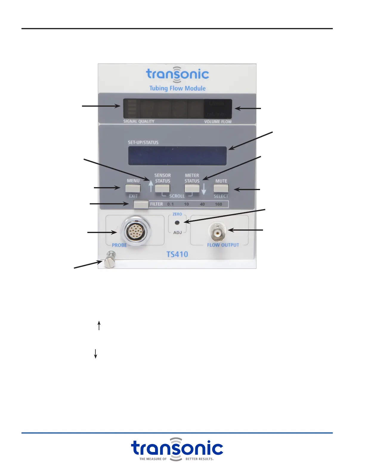Fig. 3.5: TS410 Front Panel. Blue labels are active when in Menu