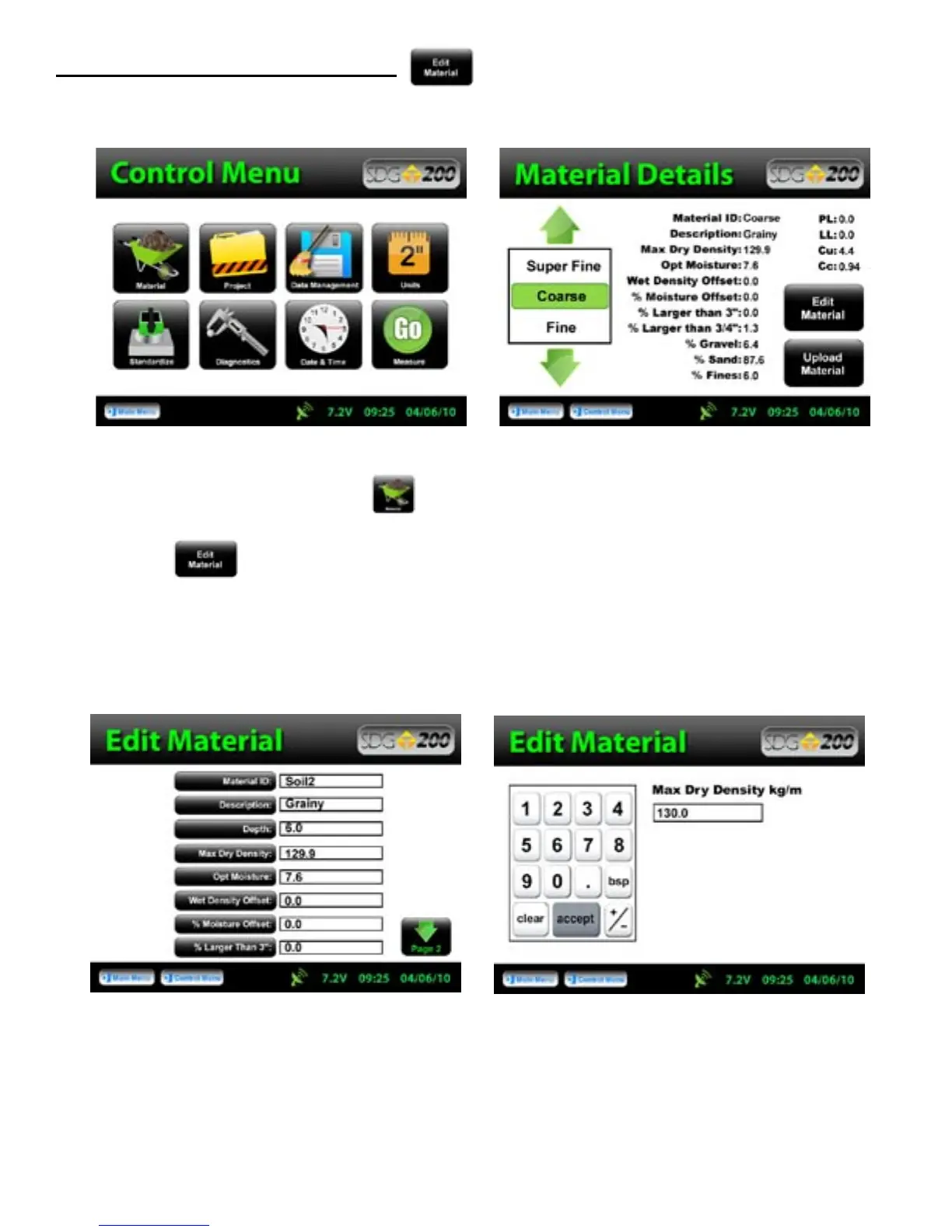 From the Control Menu, Press Material for the Material Details screen. The material highlighted in