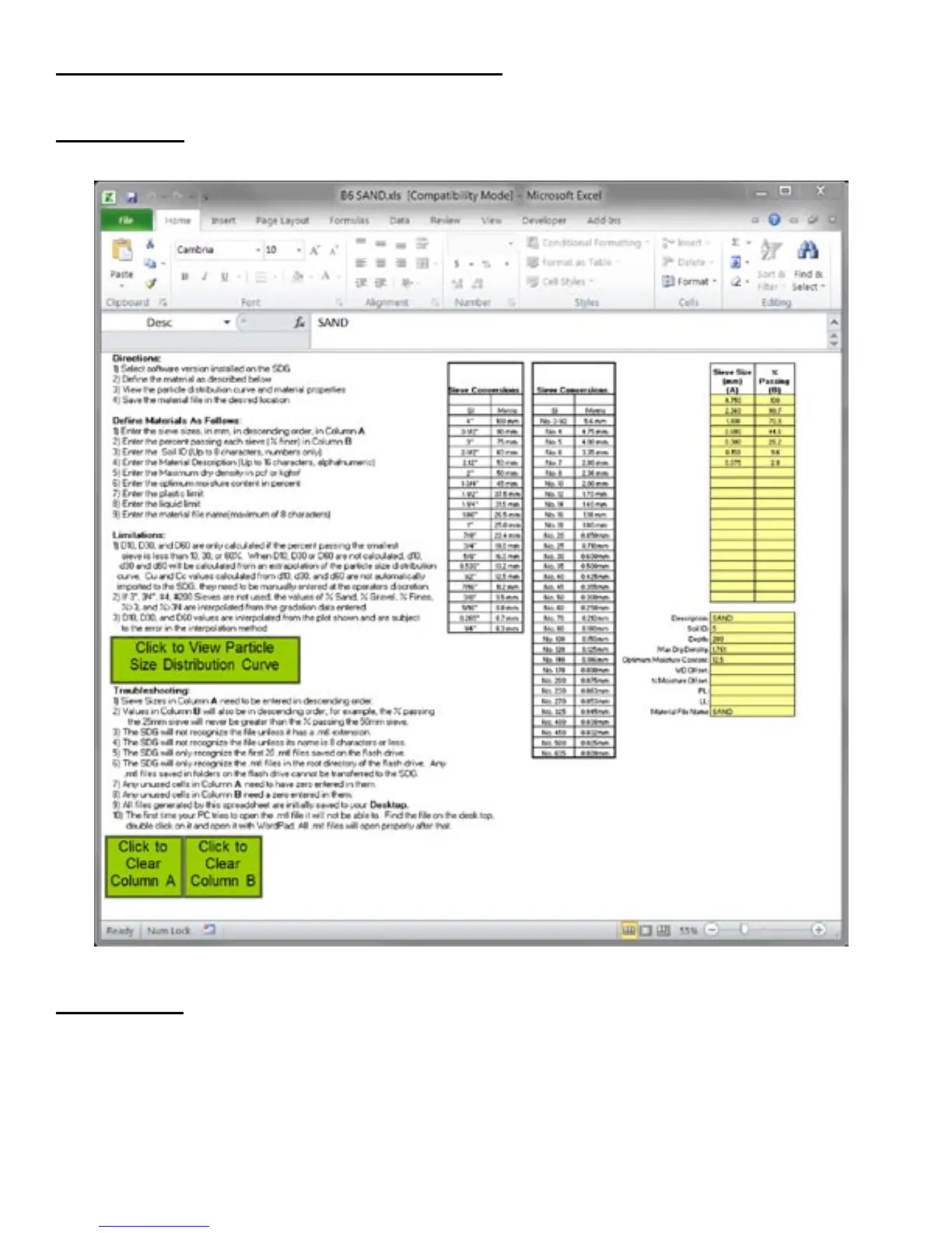 columns A and B. The data must be entered in order of decreasing sieve sizes, and the first sieve entered should