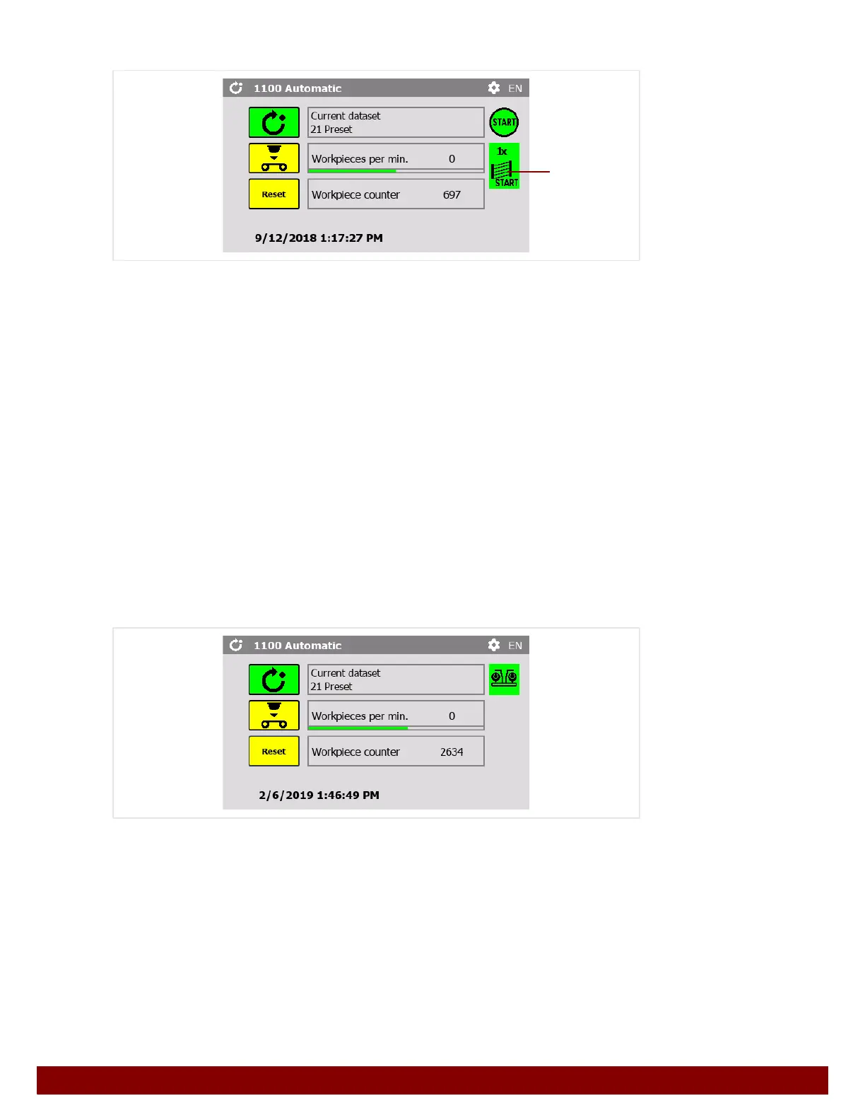 The green two-hand operation symbol appears when the machine is ready to start.