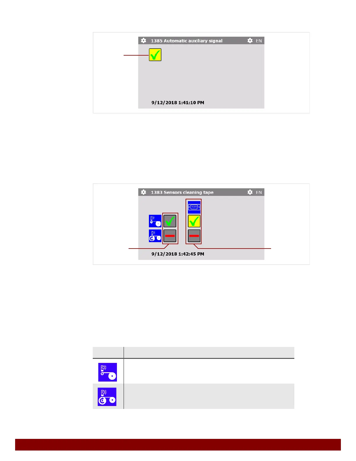 The signals of the cleaning tape sensors can be emitted at the Cleaning tape notification