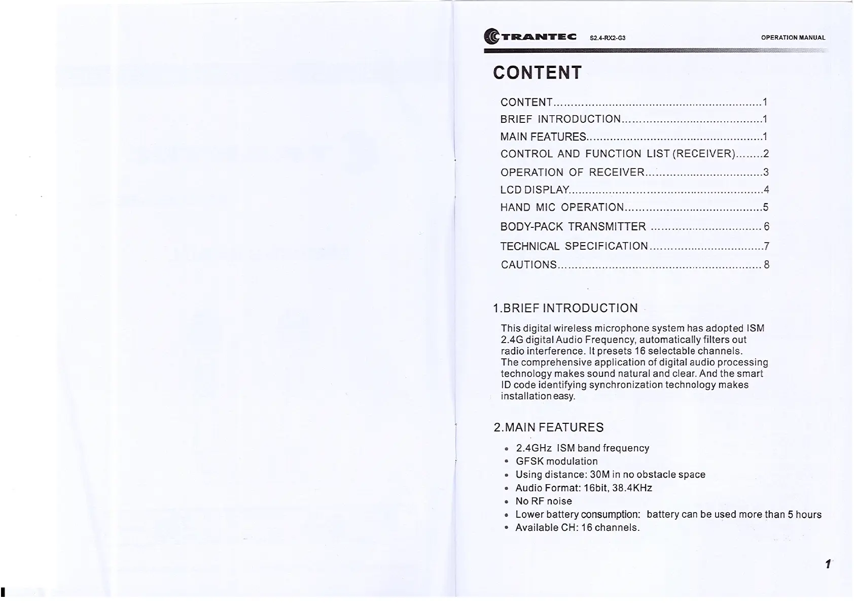 Trantec S2.4-RX2-G3 - Brief Introduction to Wireless System; Key Features of the Wireless Microphone System