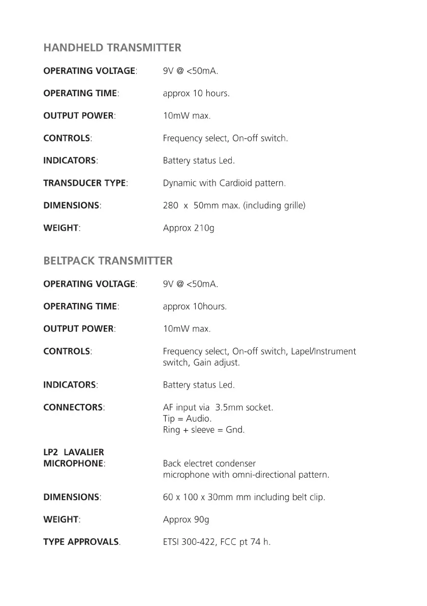 Trantec S4.4 - Transmitter Specifications; Handheld Transmitter Details; Beltpack Transmitter Details