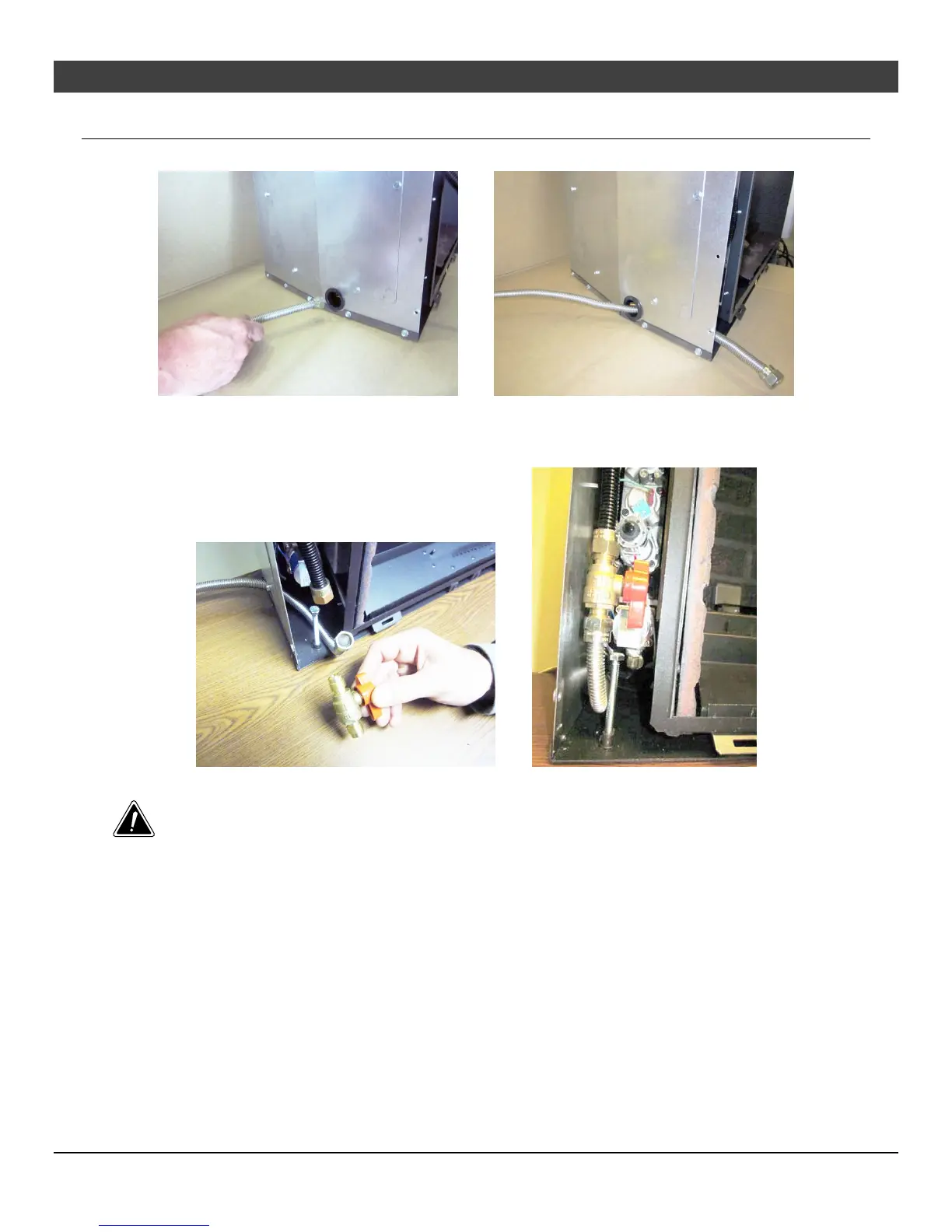 Attach the included gas shutoff valve to the end of the flex tube and gas inlet as shown below. Position so