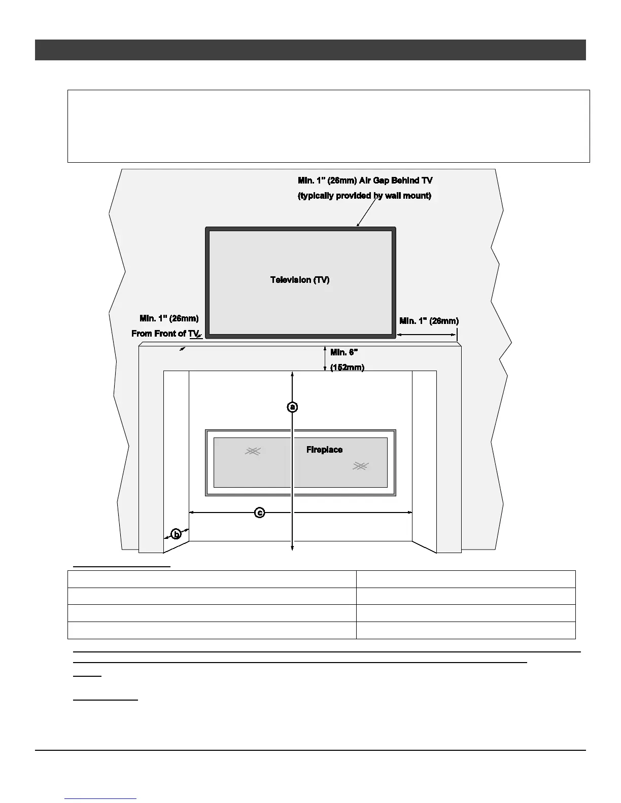 NOTE: The mantel must extend 1”(26mm) in front of the TV and 1”(26mm) to both sides. If you have a TV that is greater than