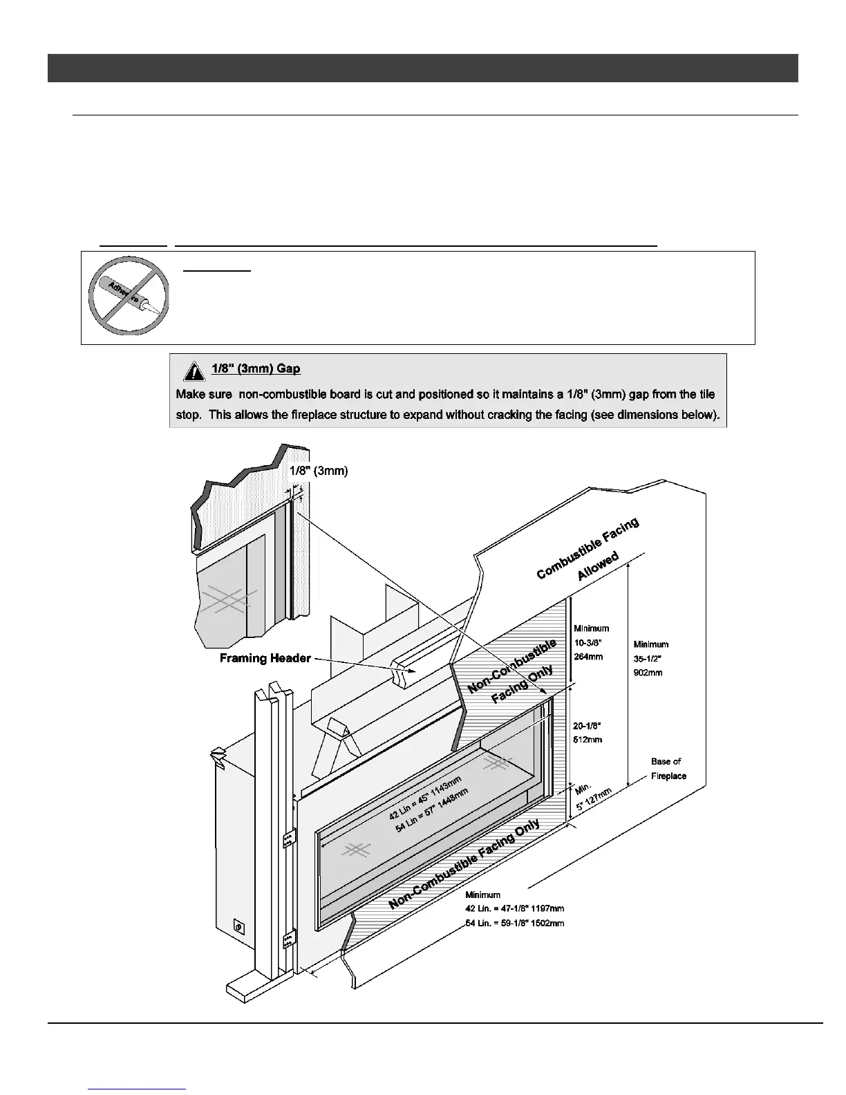 • Non-combustible facing must extend from the base of the fireplace to 35-1/2” above the base of the fireplace (see