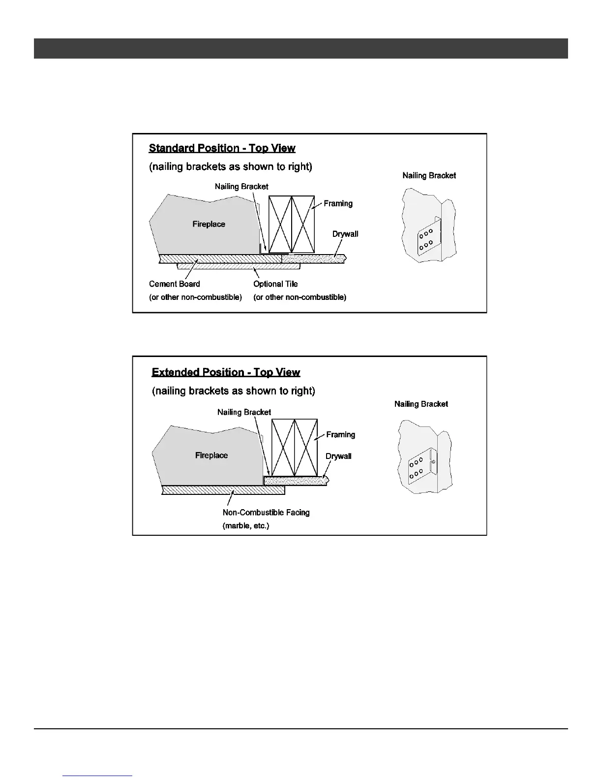 • The nailing brackets on the side of the fireplace may be placed in the standard or extended position to best suit