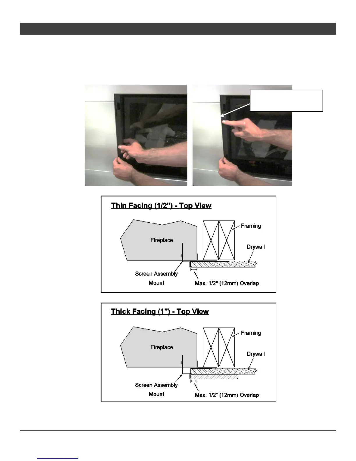 assembly to be positioned 1/2" (13mm) to 1-/12” (38mm) from the front of the fireplace. This allows facing to tuck