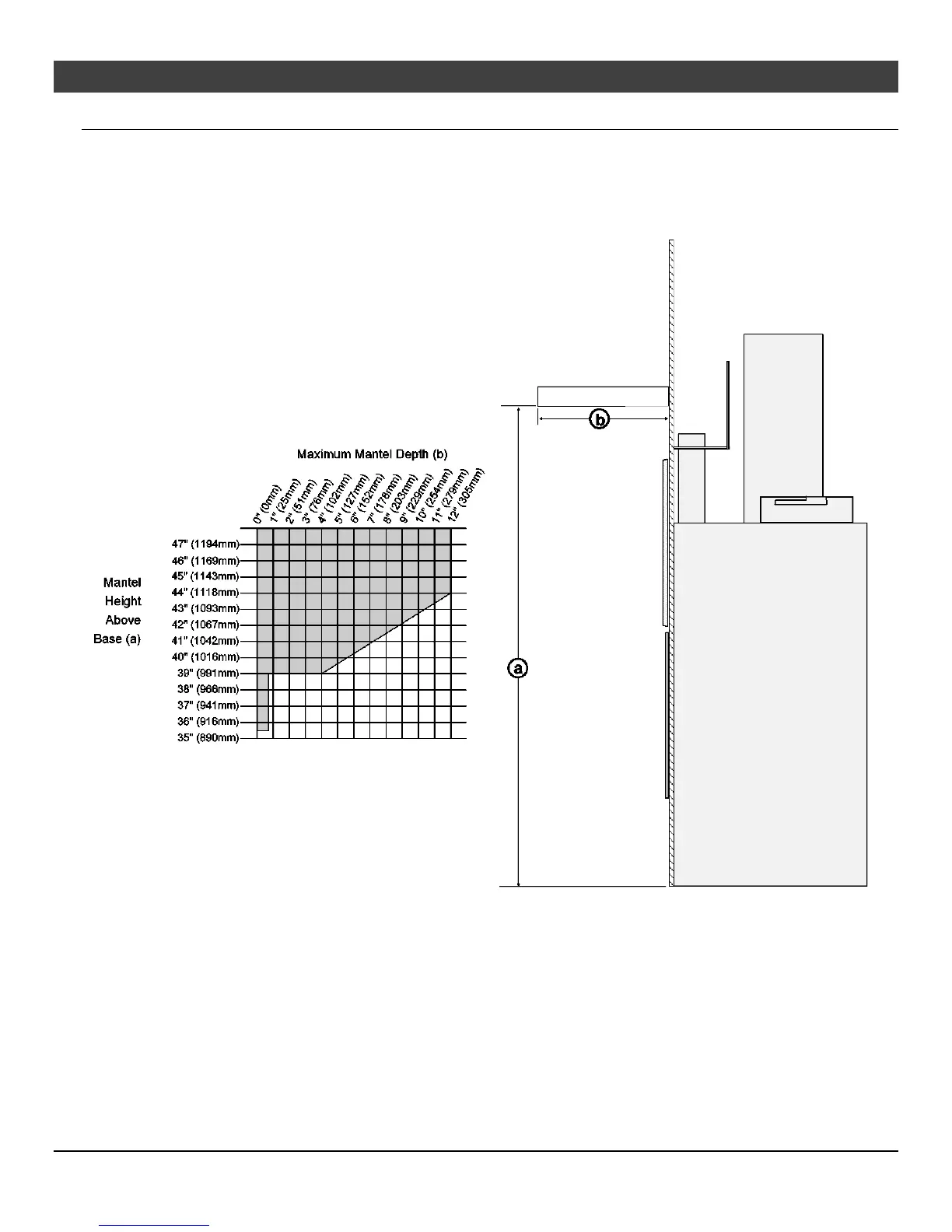 • Use the table below to determine the maximum mantel depth allowed. The mantel depth (measured from the