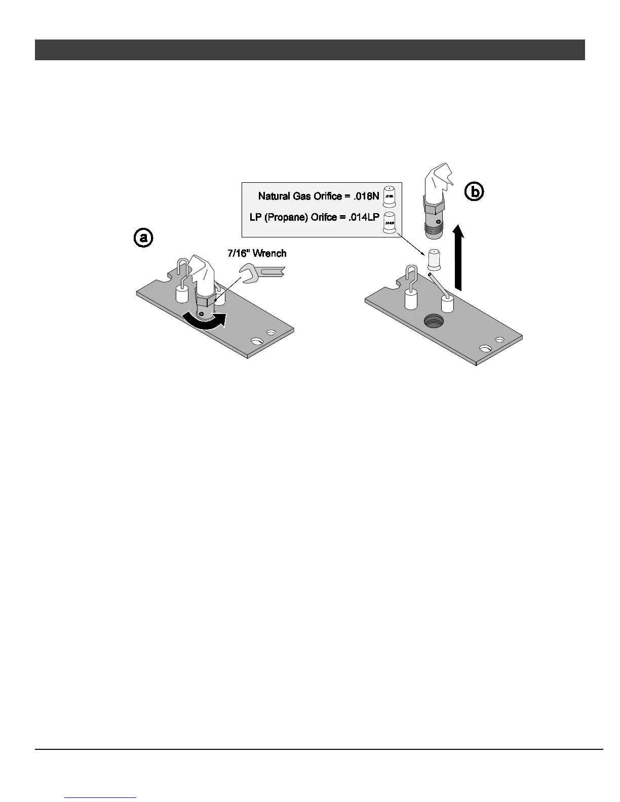 (b) Remove and discard the Natural Gas (NG) orifice. Place the LP orifice in the pilot assembly then replace the pilot
