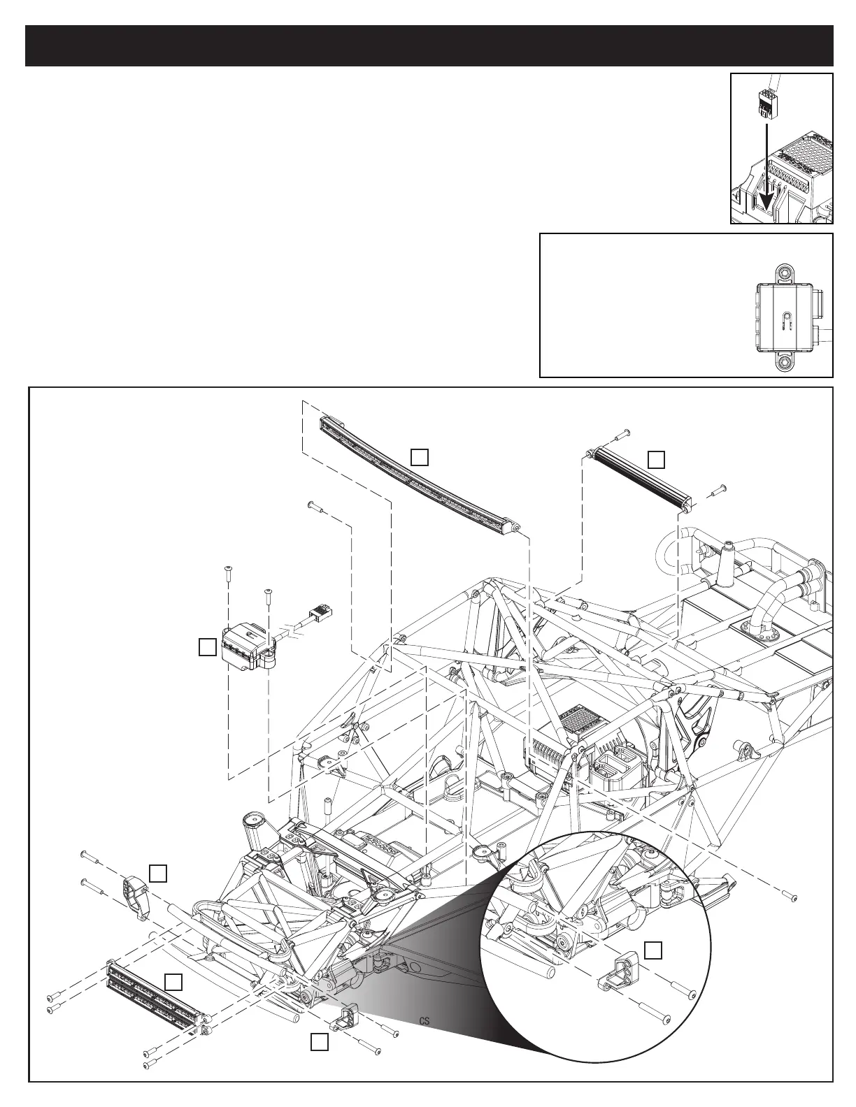 2. The front grille LED light bar mounts (B) install using the included hardware.