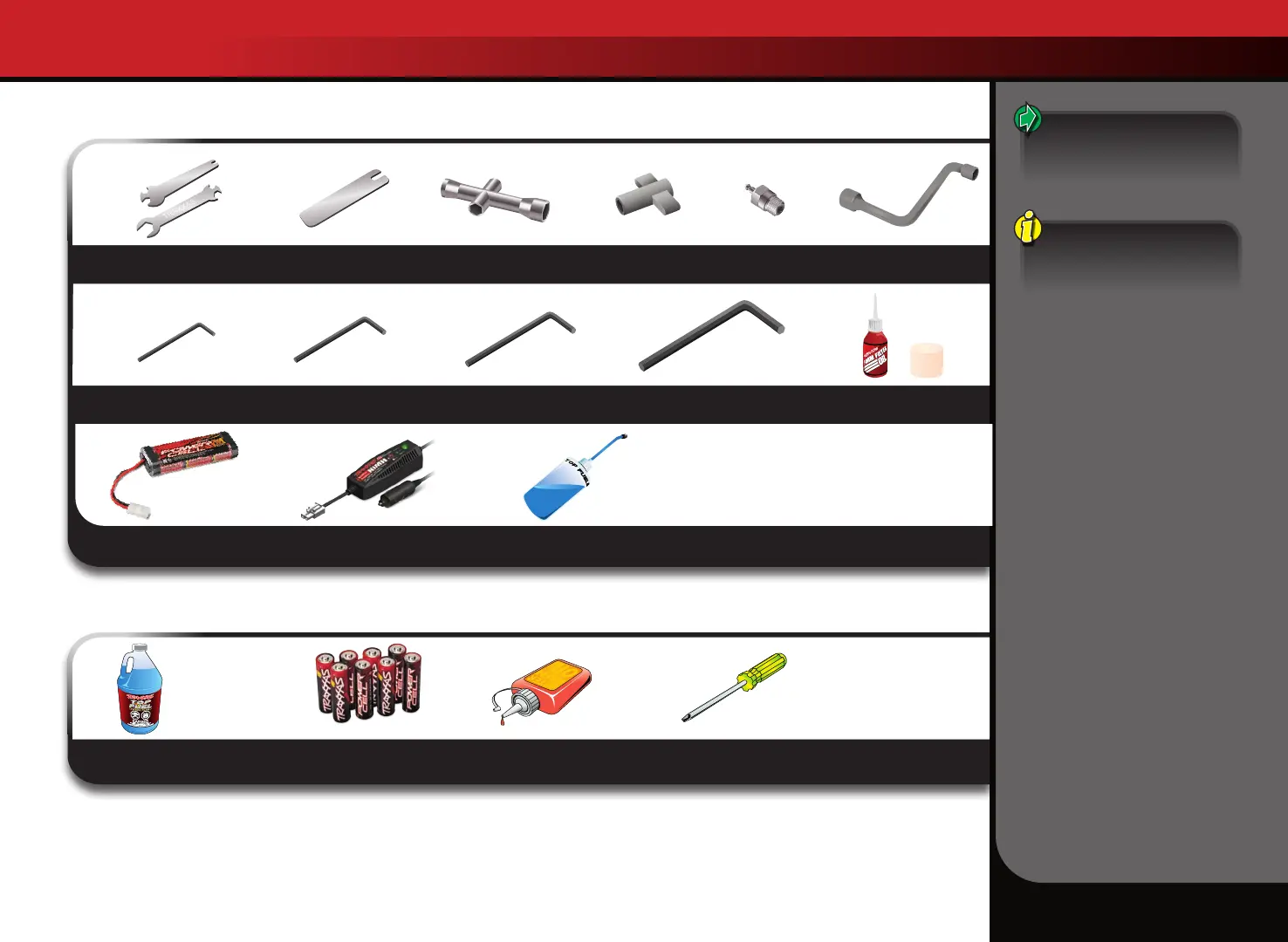 T-Maxx comes with a set of specialty metric tools. You’ll need to purchase other items, available from your hobby dealer, to operate and maintain your model.