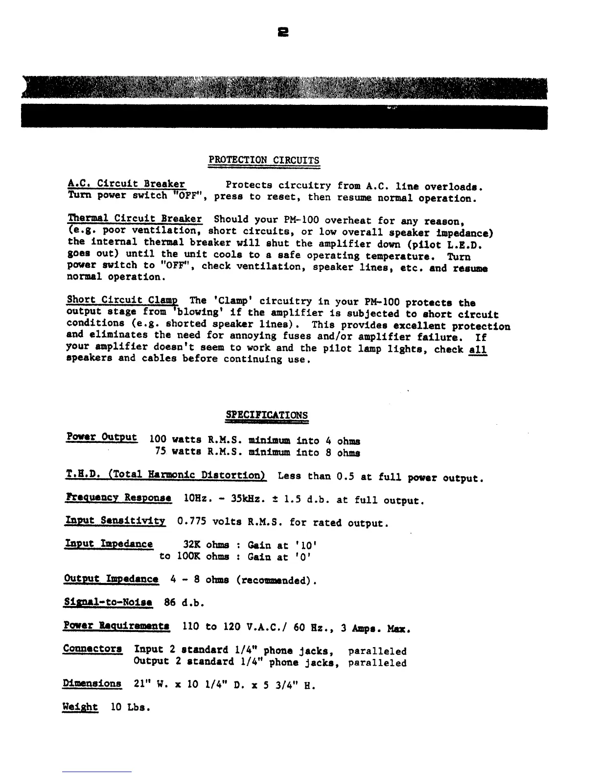 Traynor PM-100 - PROTECTION CIRCUITS; CIRCUIT BREAKER SYSTEMS; SHORT CIRCUIT CLAMP; TECHNICAL SPECIFICATIONS