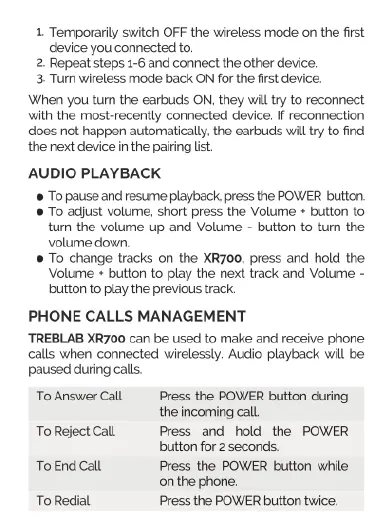 TREBLAB XR700 - Audio Playback and Call Features; Controlling Audio Playback; Managing Phone Calls