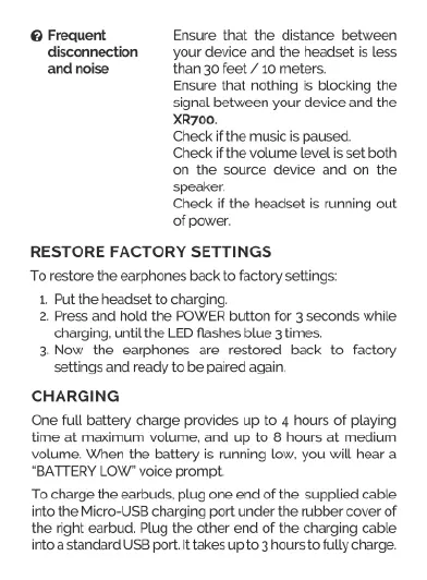 TREBLAB XR700 - Maintenance and Charging Procedures; Restoring Factory Settings; Earbud Charging Guide