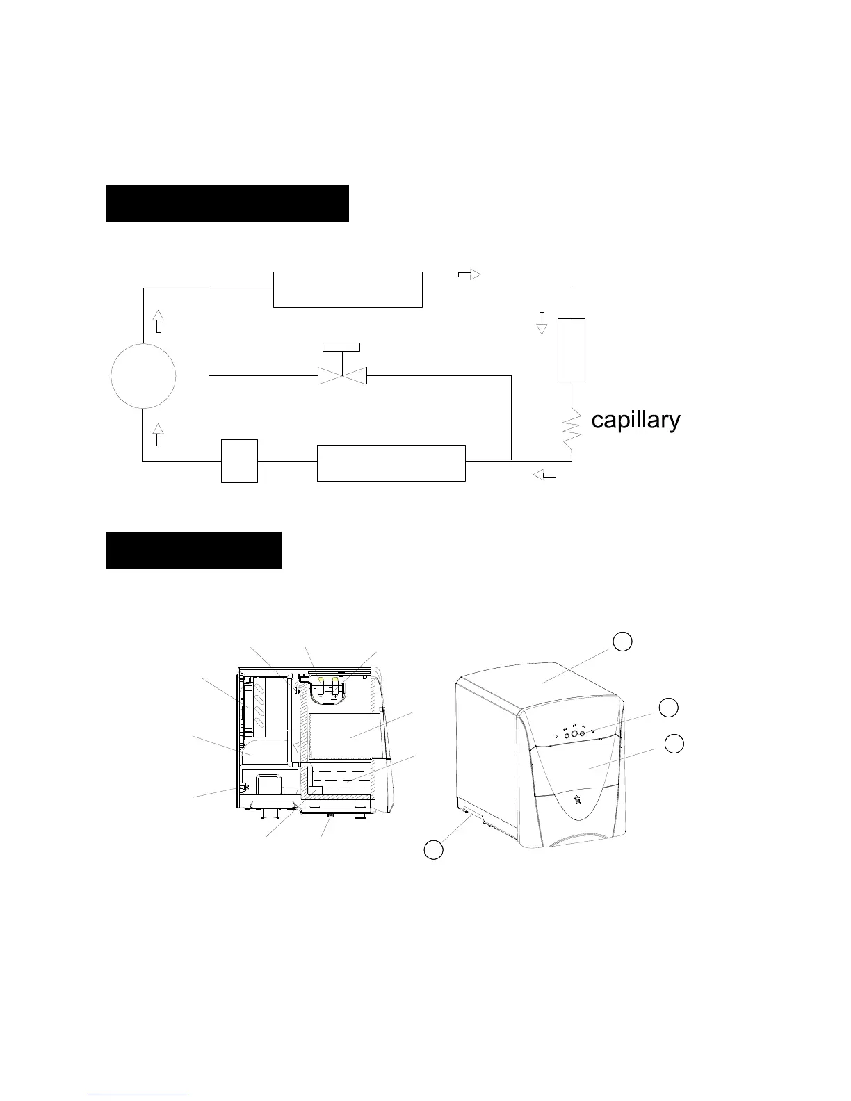 1. Wasserbehälter 2. Eisbehälter 3. Wasserauffang 4. Verdunster
