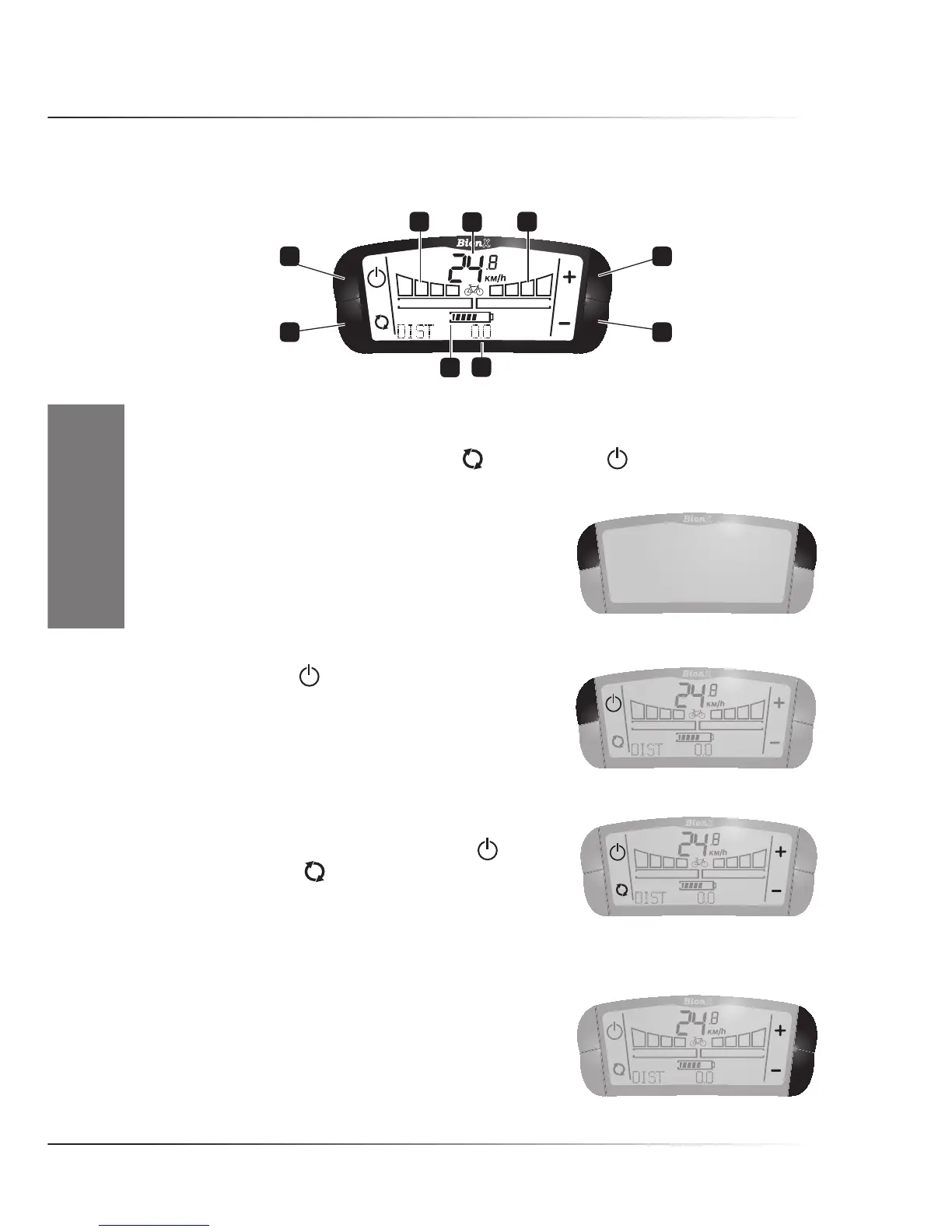 1•Geschwindigkeit2•AktuelleUnterstützungsstufe3•Ein/„+“-Taste4•„-“-Taste