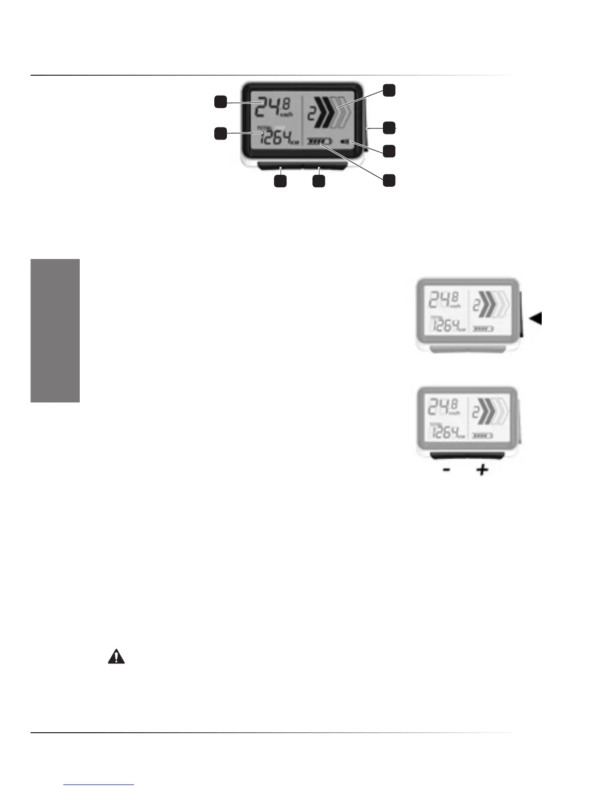 Taste„-“(links),Moduswechsel-Taste7•Tagesfahrstrecke,Gesamtfahrstrecke8•Geschwindigkeit