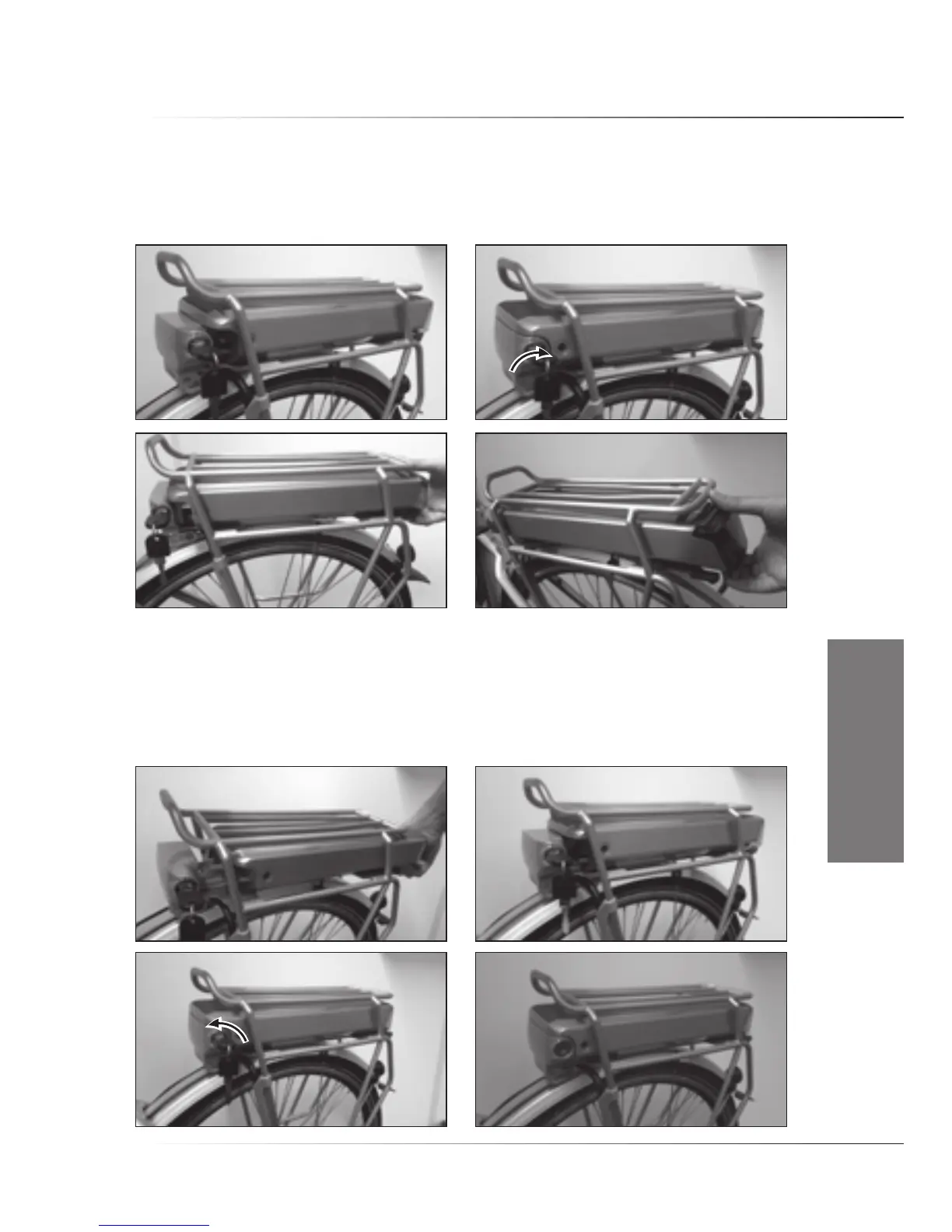 Steek de sleutel in het slot van de docking en draai deze rechtsom (stap 1, 2). Schuif de accu uit de