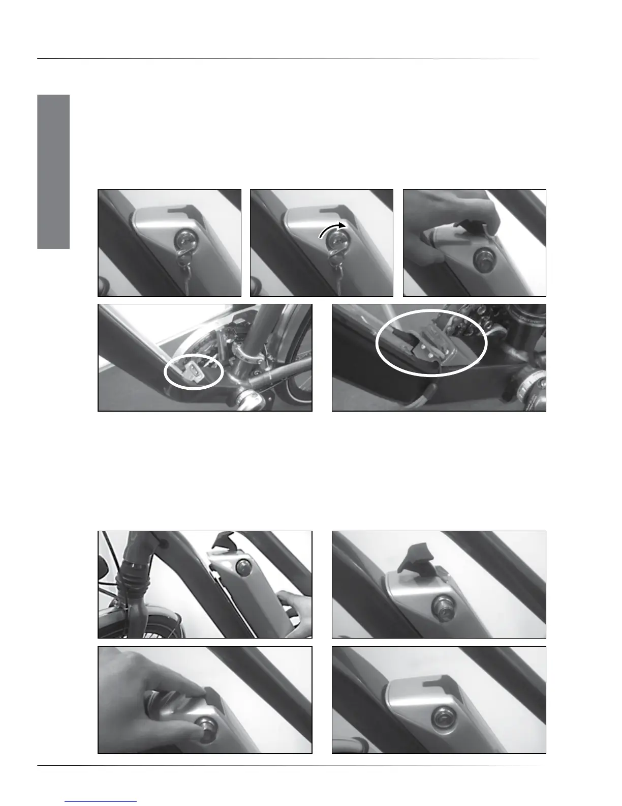 When the battery is fully in place, push the lock in until it clicks (4). Do not ride the bike with the