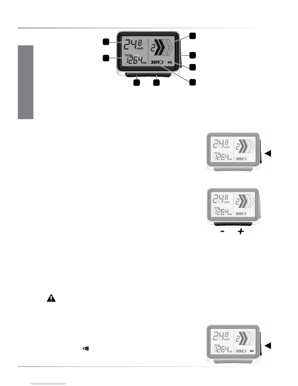 level 5• Front +(right hand) button, Miles/Kilometer switch button 6• Front -(left hand) button,