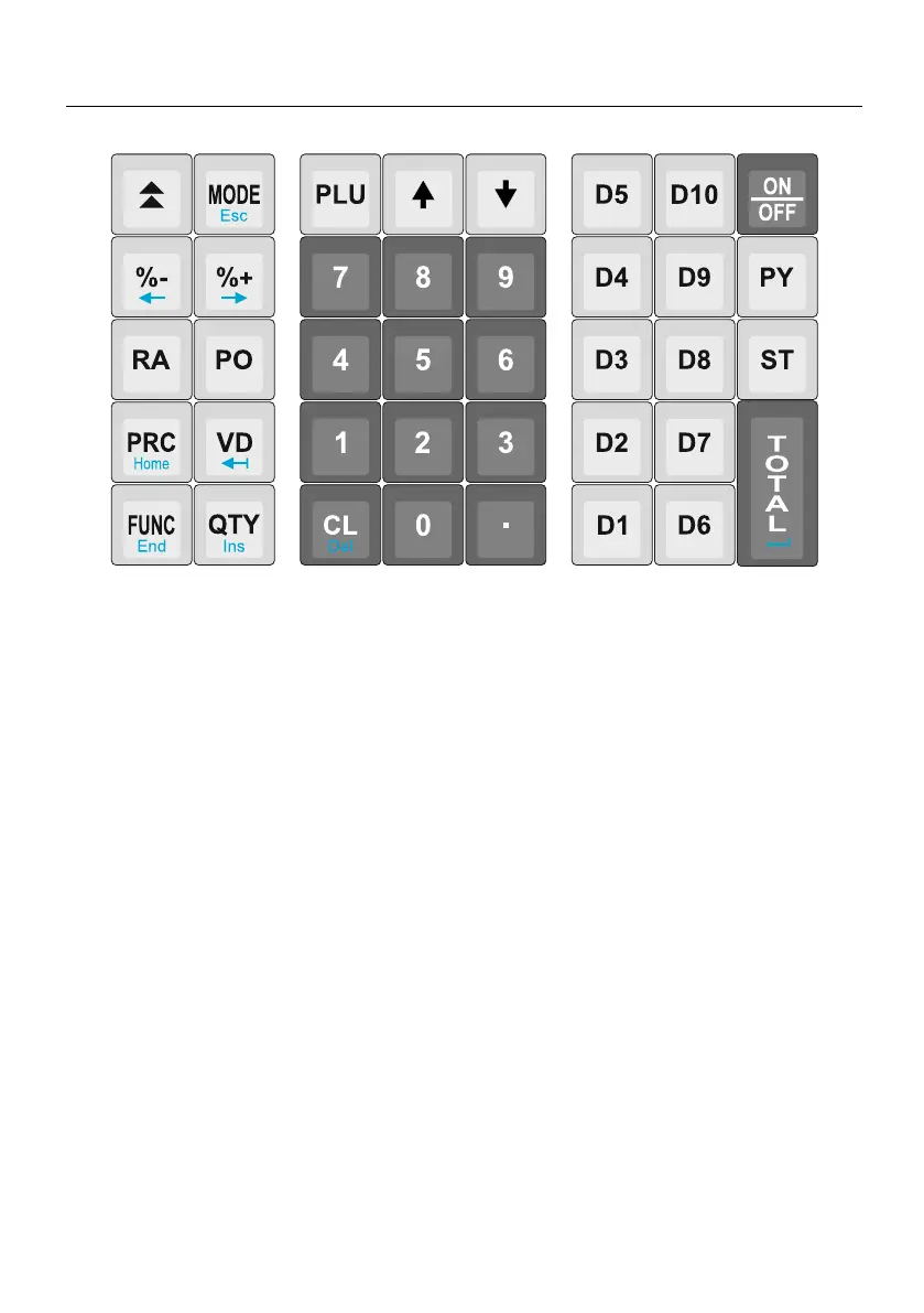 The ECR Keyboard is composed by 33 keys, separated in several groups: