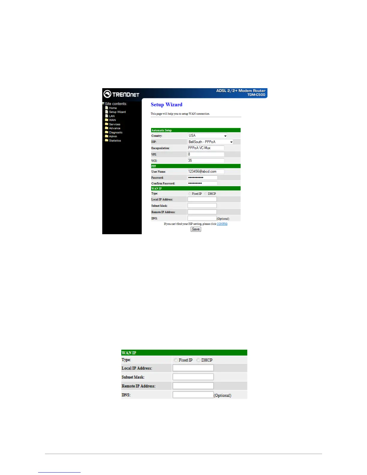 “Remote IP Address”(Default Gateway) and “DNS” which will be provided by your ISP. Click “Save” after