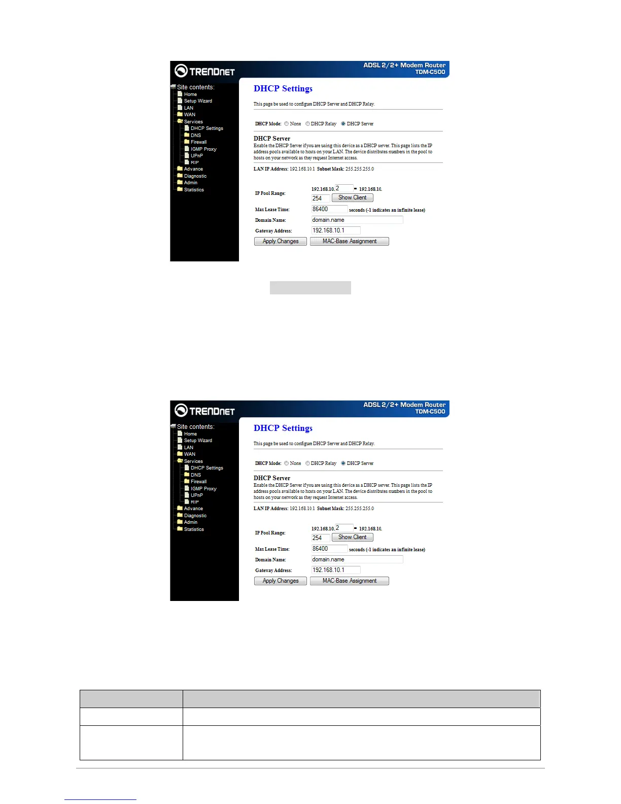 Server page; while acting as DHCP Relay, you can setup the relay at the DHCP Relay page.
