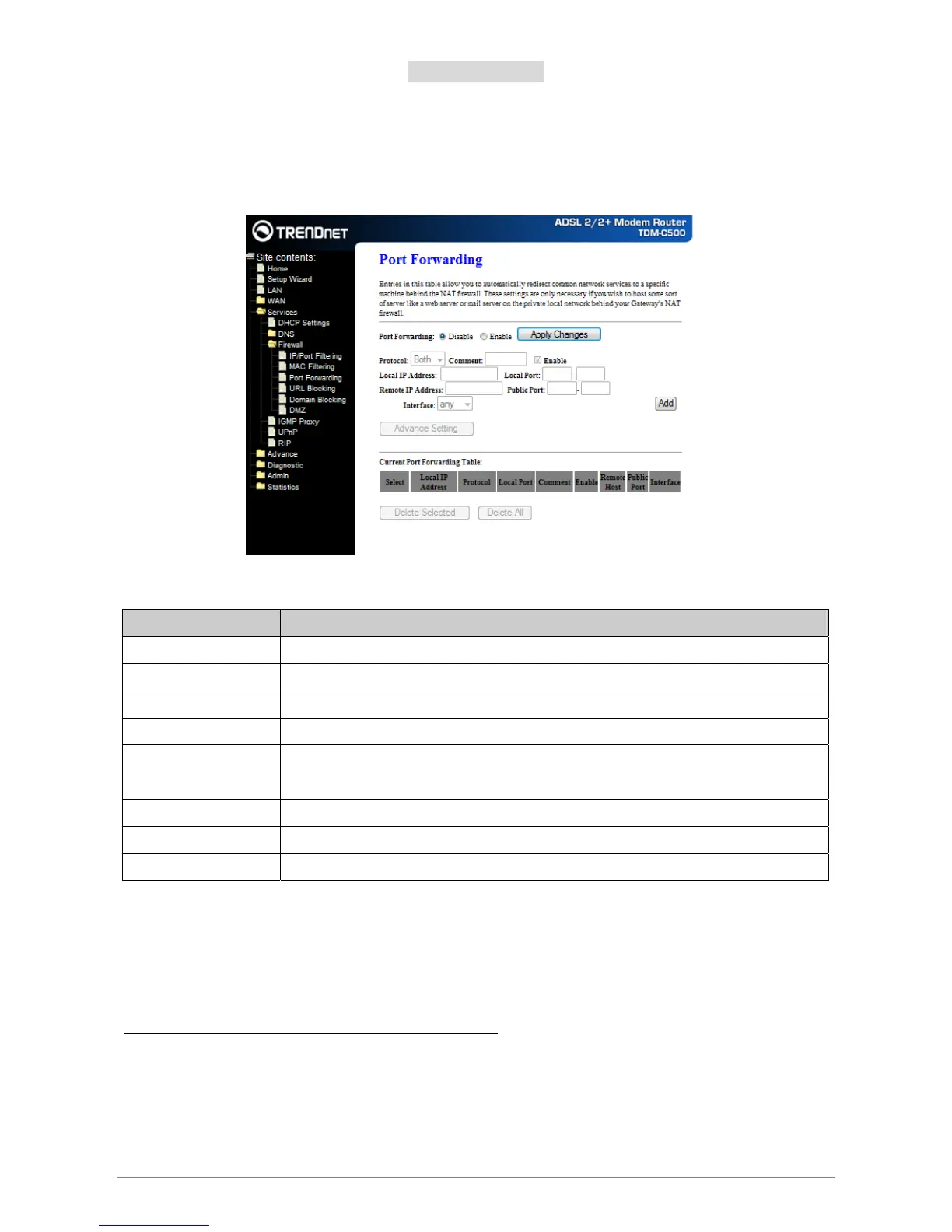 Delete the selected port forwarding rules from the forwarding table. You can click the checkbox at the Select