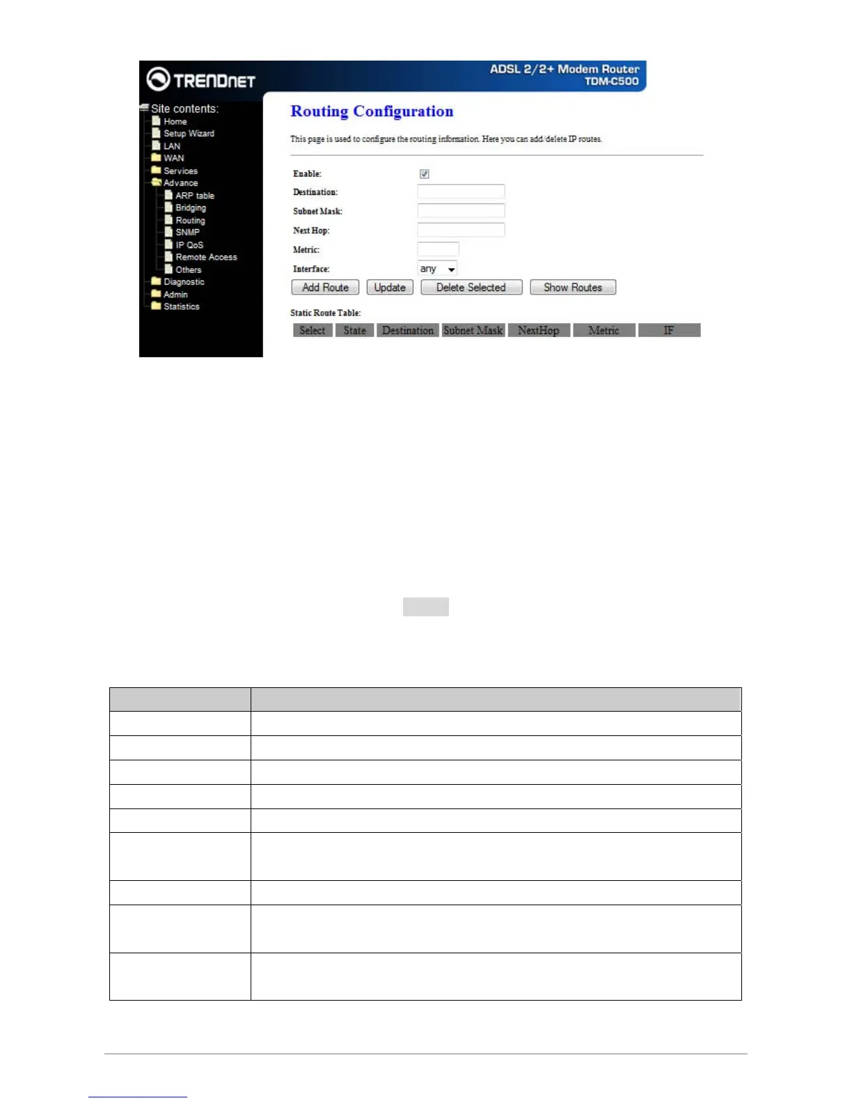 Delete a selected destination route on the Static Route Table.