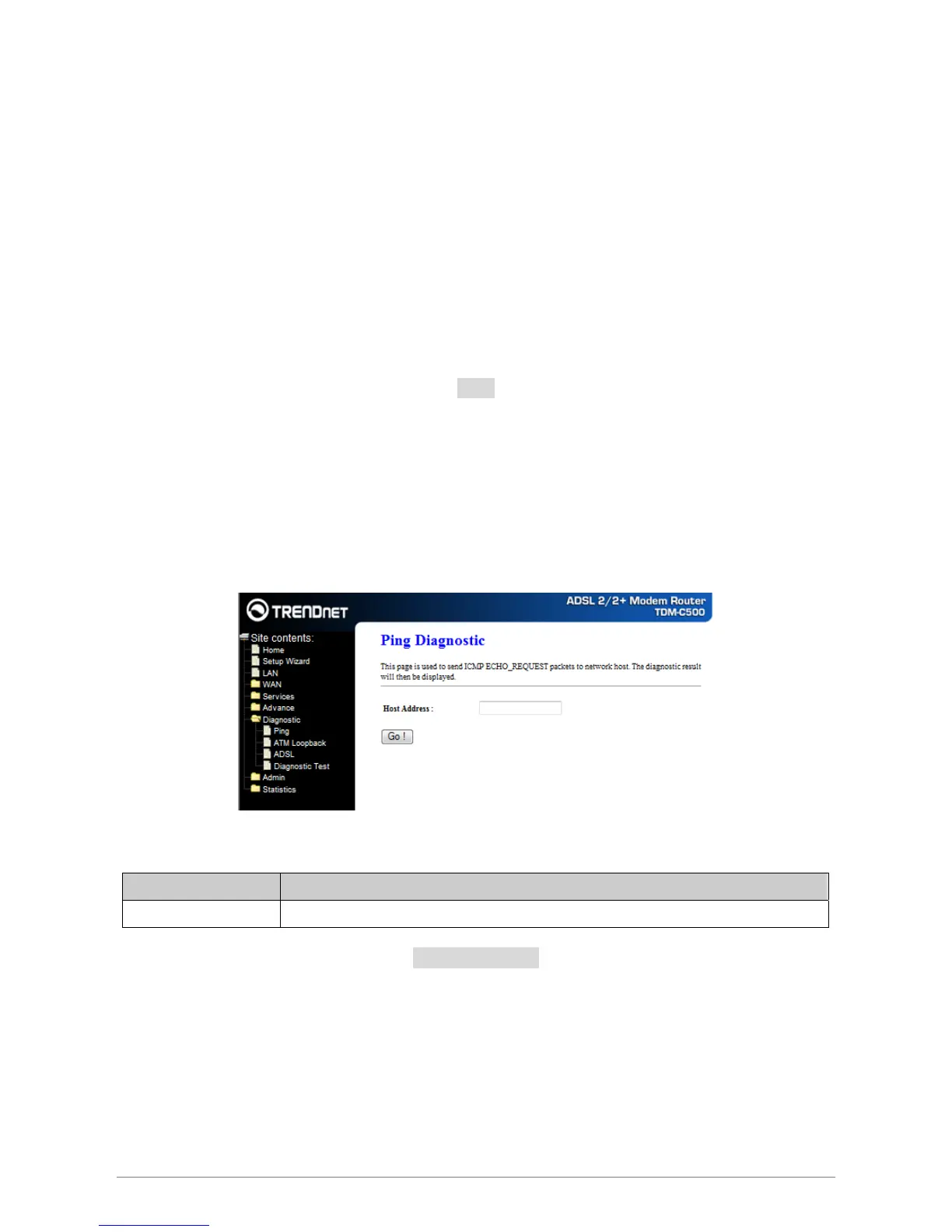 and enter the IP address in the Host Address field. Click Go! To start the ping command, the ping result will