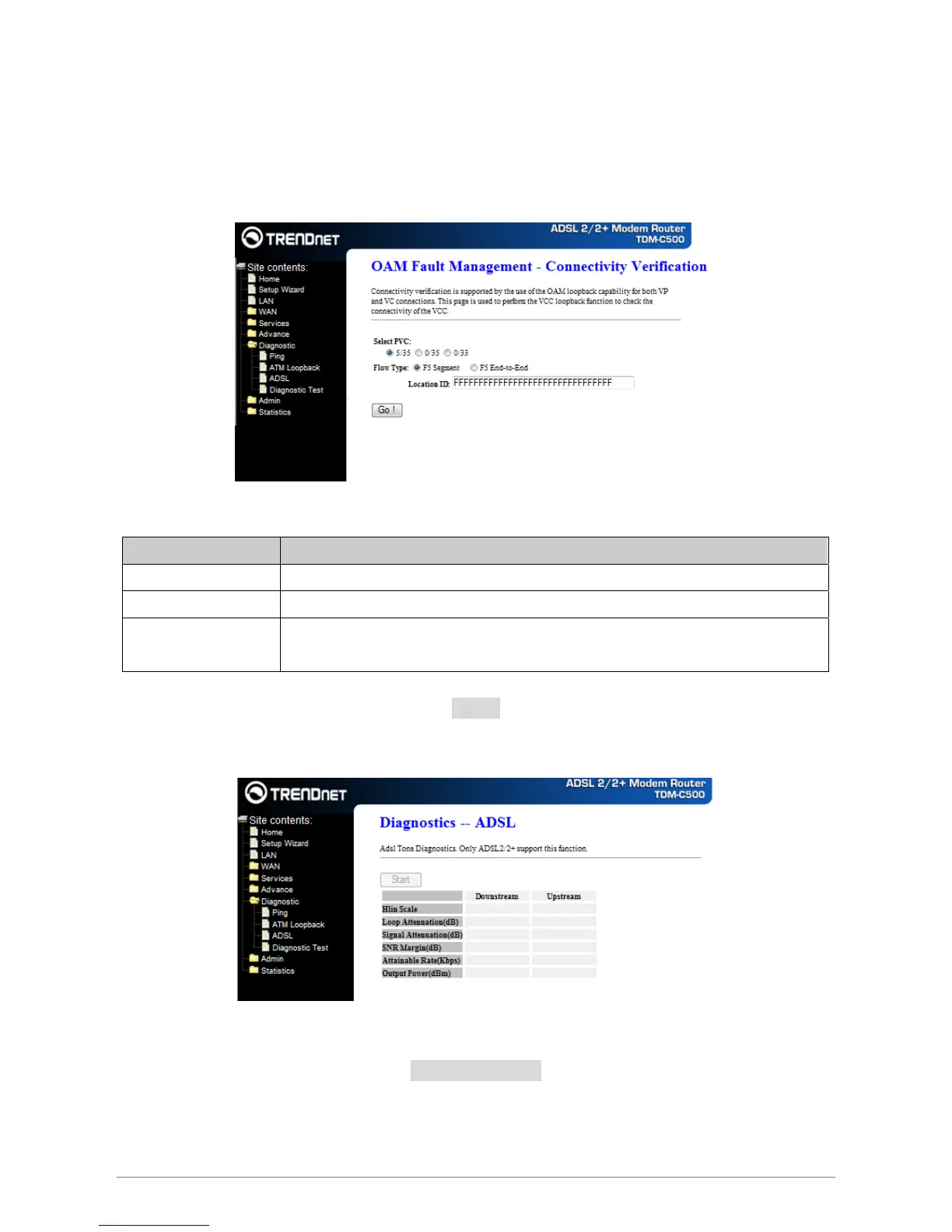 This page shows the ADSL diagnostic result. Click Start button to start the ADSL diagnostic.