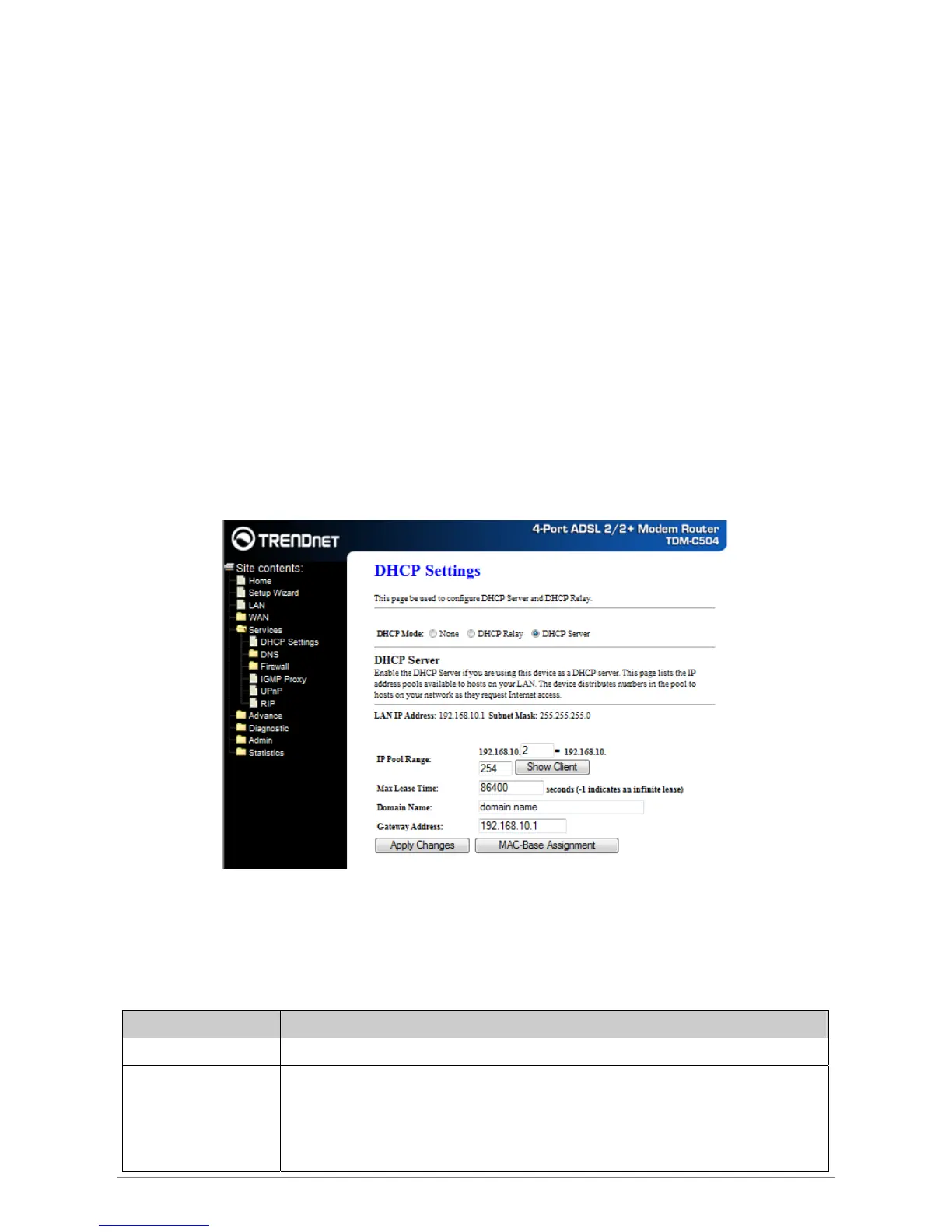 Server page; while acting as DHCP Relay, you can setup the relay at the DHCP Relay page.