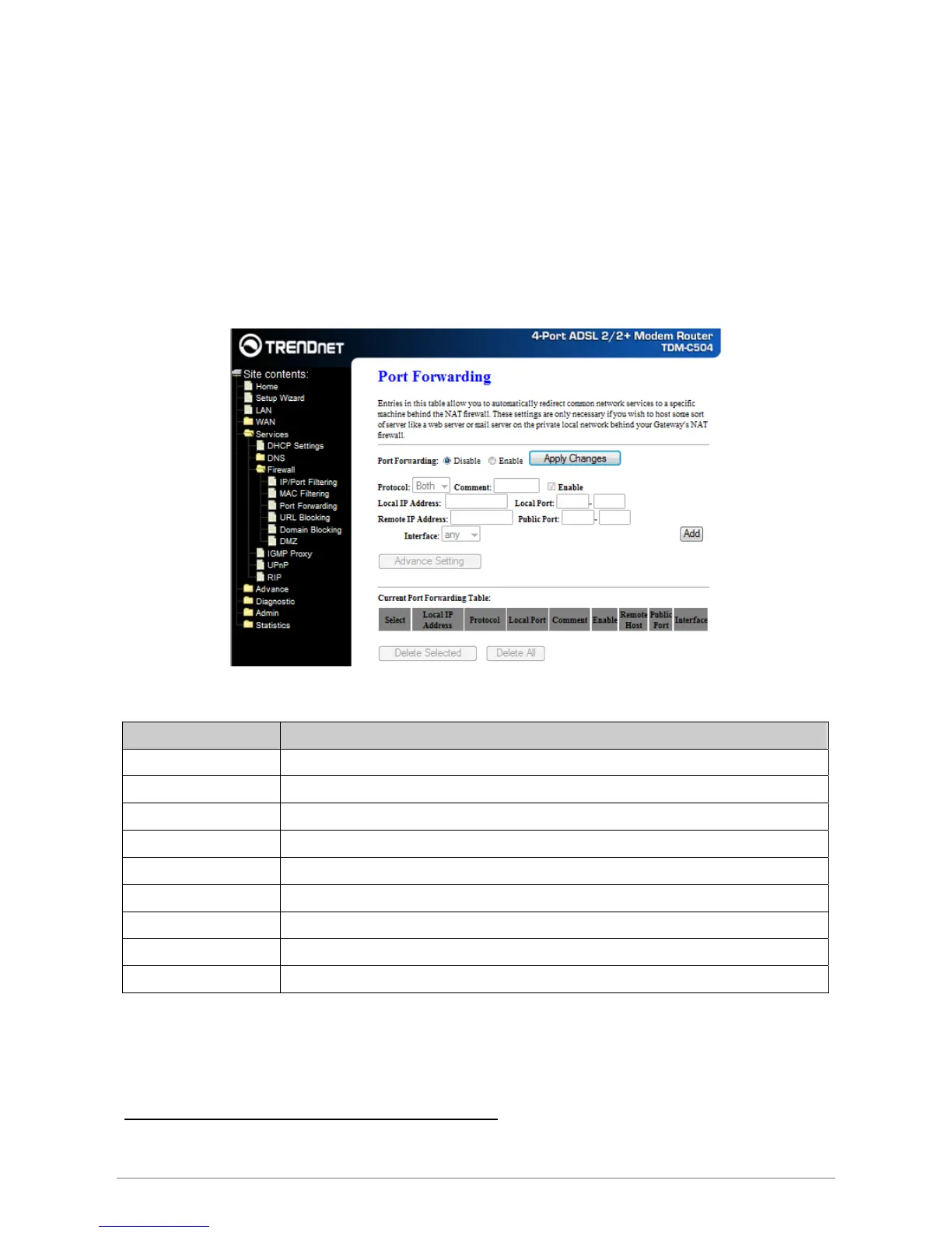 Function buttons for the Current Port Forwarding Table: