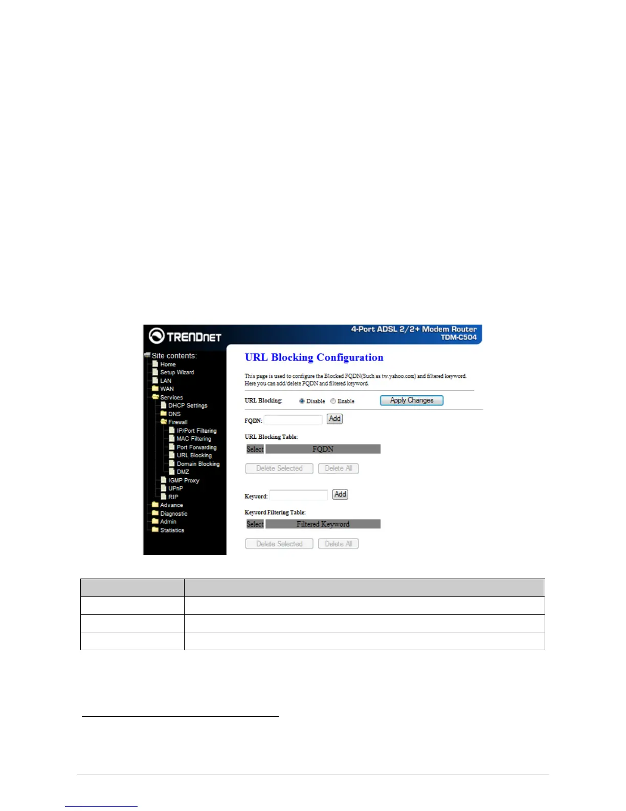 Function buttons for the URL Blocking Table: