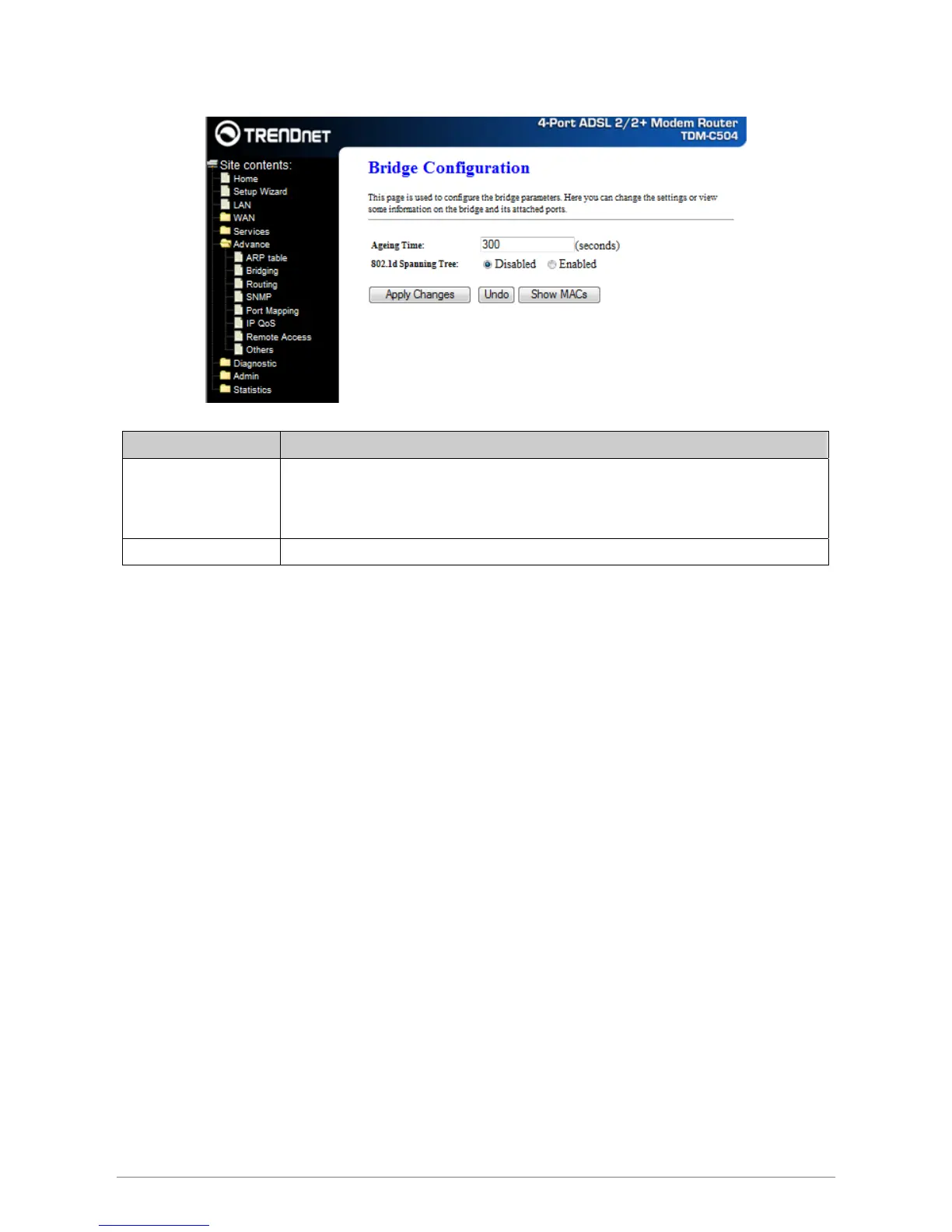 You can enable/disable Spanning Tree Protocol and set MAC address aging time in this page.
