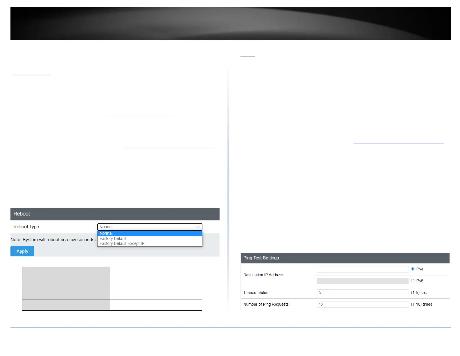• Factory Default Except IP: Resets all switch configuration settings to factory