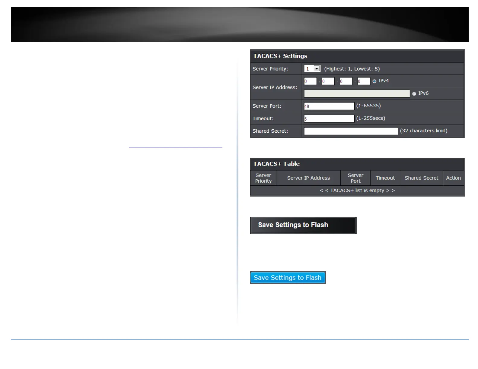 • Server IP Address – Enter the TACACS+ Server IP address.