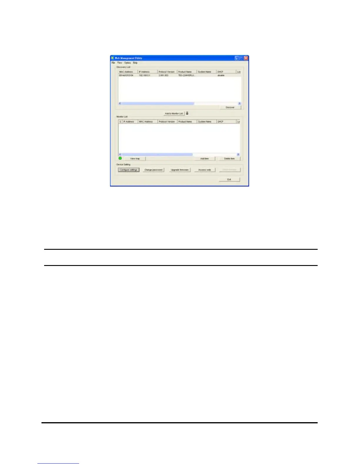 The Web Management Utility is divided into four sections, Discovery