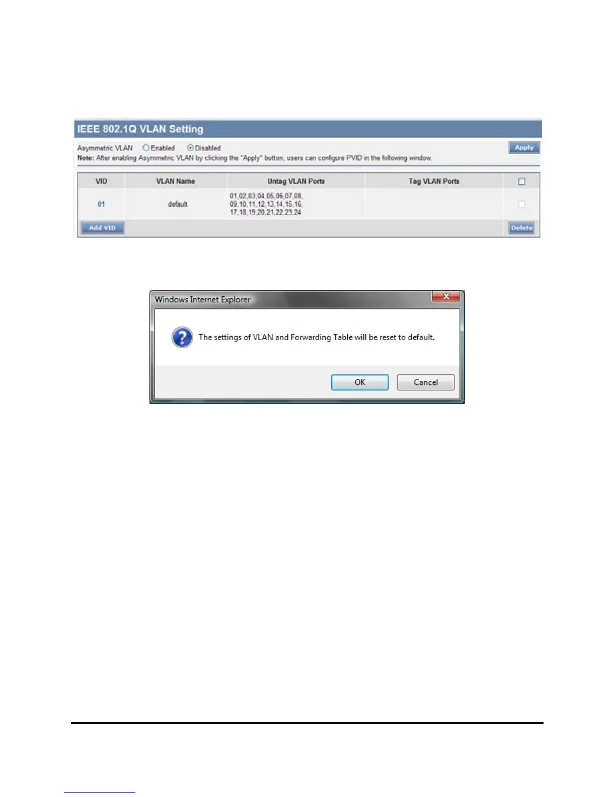 Note: The Settings of VLAN, IGMP Snooping and Forwarding Table will be reset to