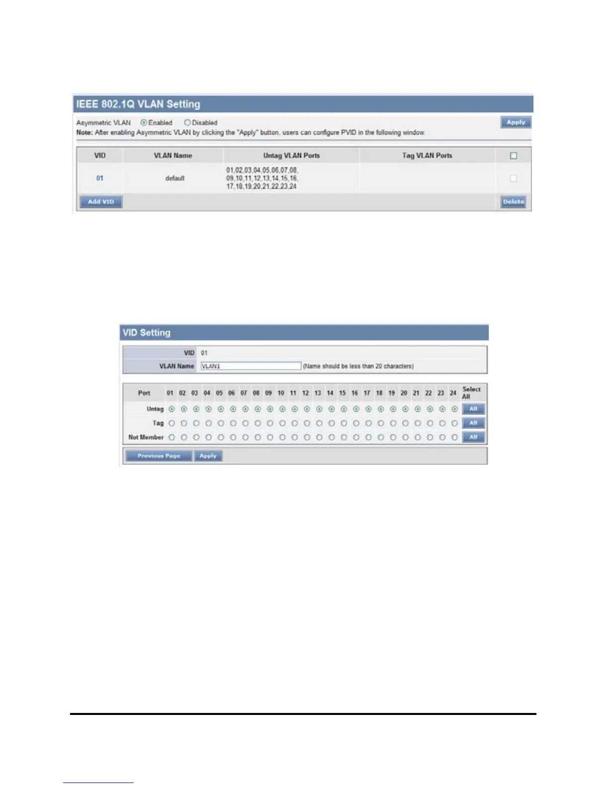 Add VID: Click to create a new VID group, assigning ports 1 ~ 24 as