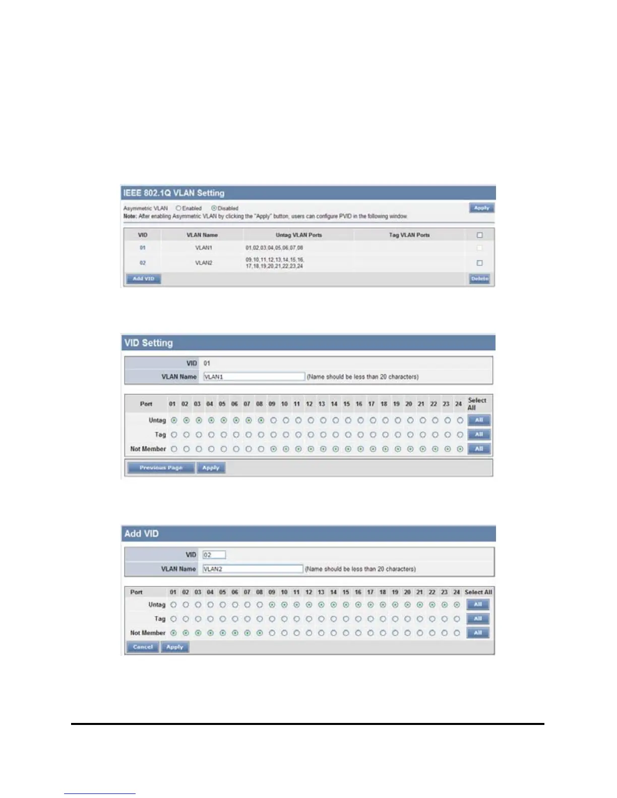Step2: Create VID 02 and set port 9~24 to “Untag Port” member, then apply setting.