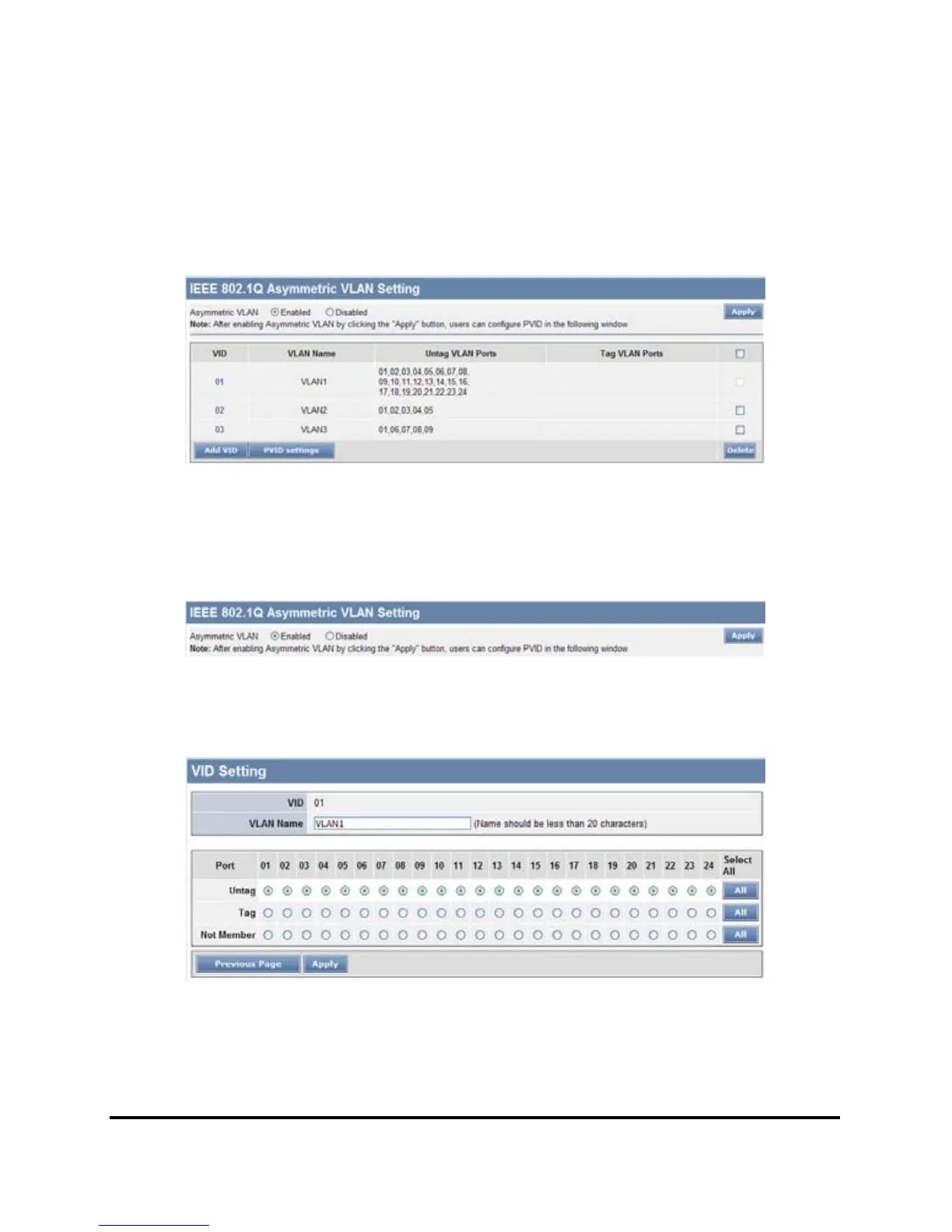 Step2: Set VLAN1 port 1~24 to āUntagā ports, then apply setting.