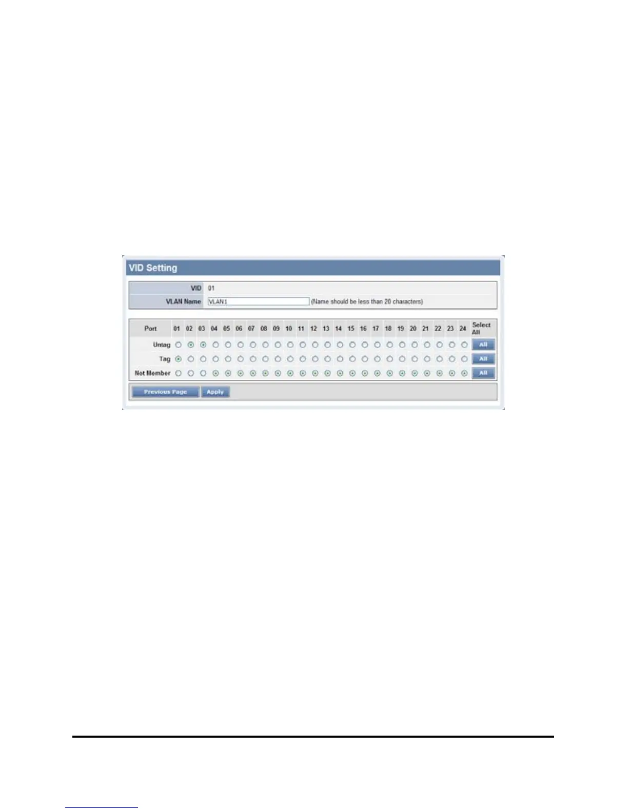 Step1: Set Switch1’s VLAN1 port 1and 4~24 to “Not Member”, then apply setting.