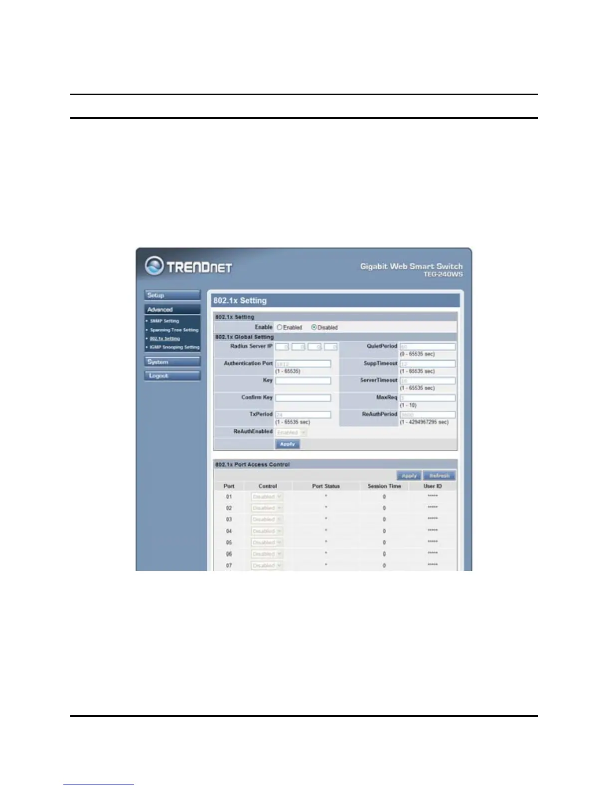 Enable: Enable or Disable the 802.11x function on the Web Smart