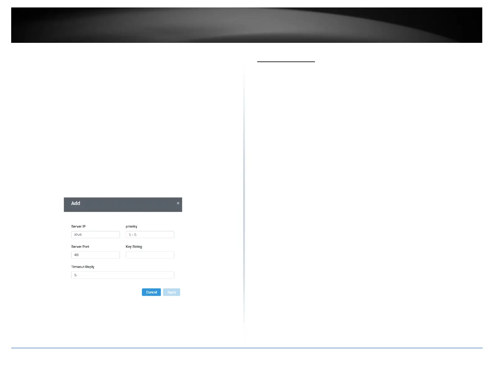 • Key String – Enter the default authentication and encryption key for TACACS+