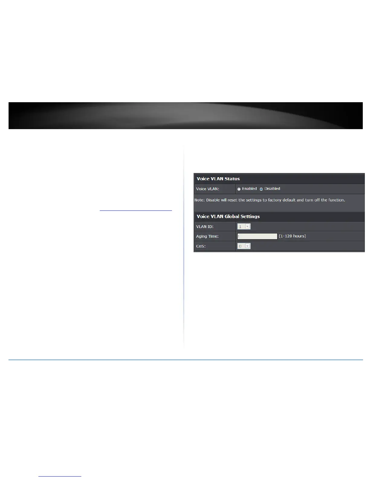 o Enable - The voice VLAN feature is active. The other parameter fields